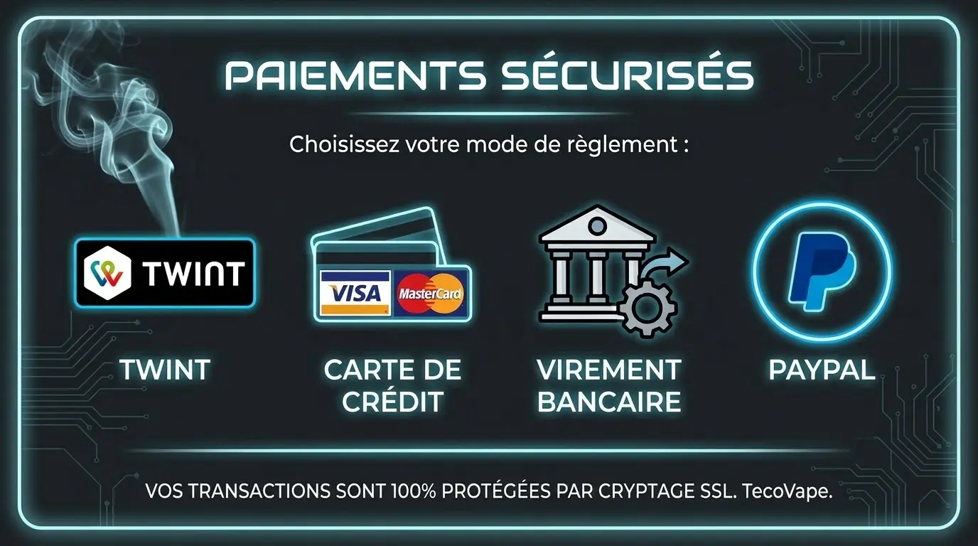 Sécurité SSL : Votre connexion sur TecoVape est sécurisée. Le cadenas dans votre barre d'adresse confirme que vos informations (nom, adresse, détails de paiement) restent privées et ne sont jamais stockées sur nos serveurs.