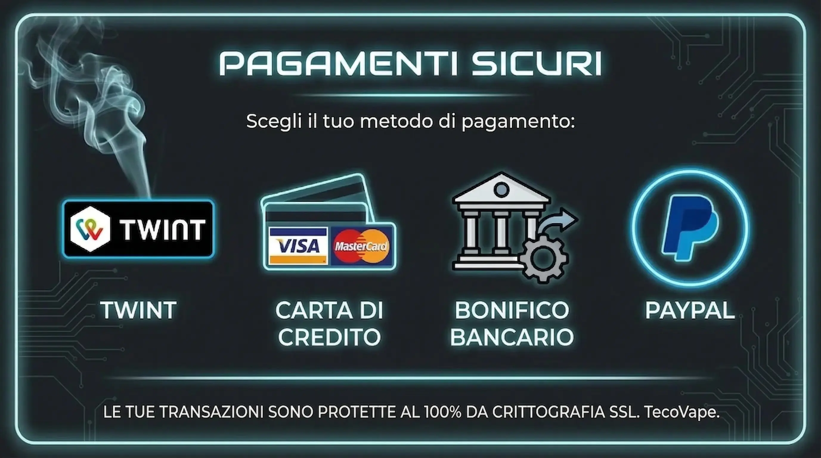 Sicurezza SSL : La vostra connessione su TecoVape è protetta. Il lucchetto nella barra degli indirizzi conferma che le vostre informazioni (nome, indirizzo, dettagli di pagamento) rimangono private e non vengono mai archiviate sui nostri server.