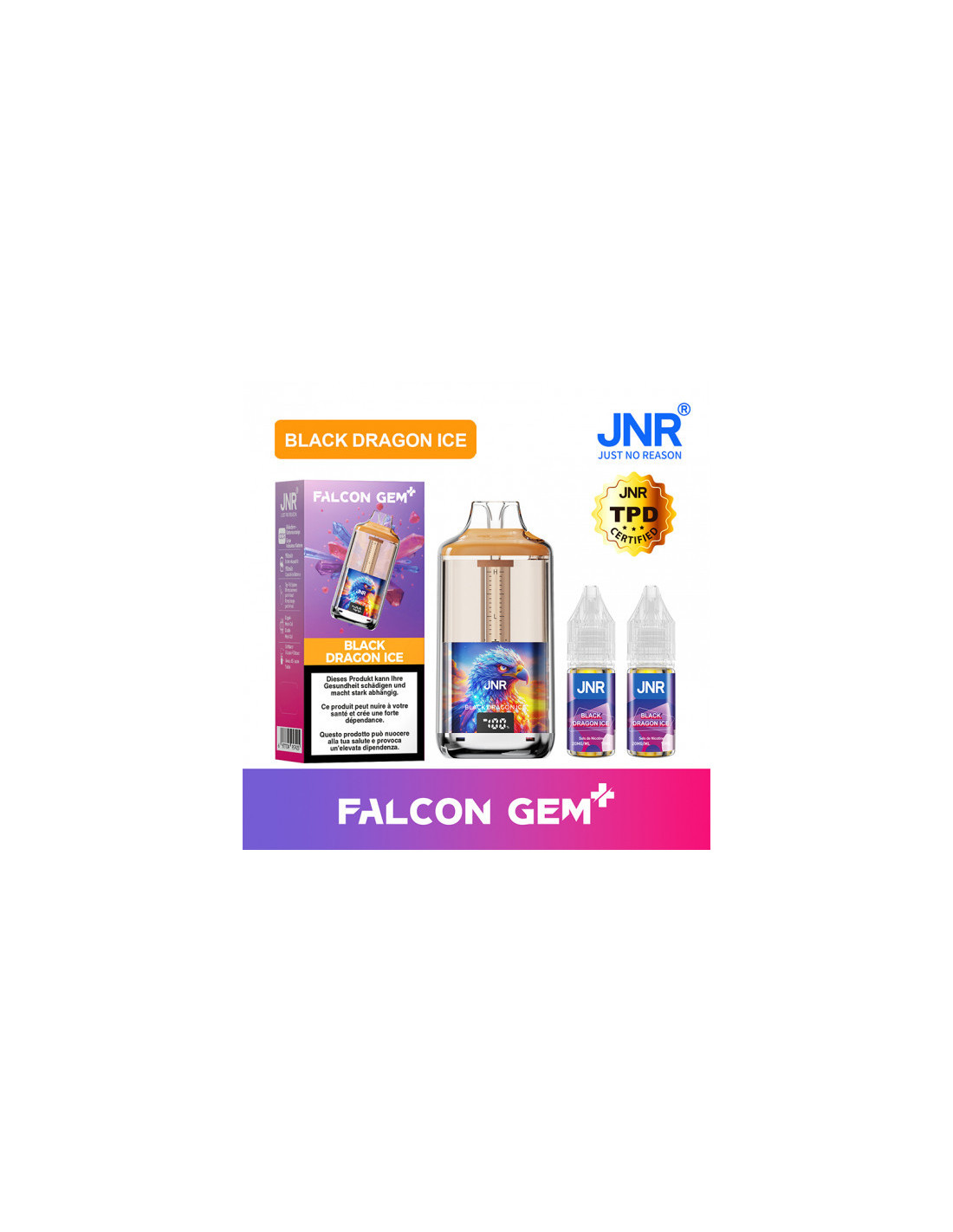 La saveur Black Dragon Ice du Falcon GEM+ 30K de JNR, c'est une mûre sombre et juteuse qui pose les bases, un fruit du dragon exotique et vibrant qui apporte une touche mystérieuse, puis une fraîcheur givrée intense qui enveloppe l'ensemble. Un mélange audacieux, puissant et rafraîchissant à chaque bouffée.